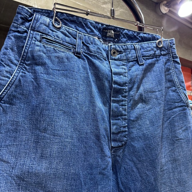 ■生産国 日本製 ■サイズ W30L32.5 (表記 W31) 総丈:110cm ウエスト:77cm 股上:28cm 股下:82cm ワタリ:29cm 裾幅:22cm ■素材 コットン100% ■アイテム フロント右太ももに薄汚れ。 左裾に小ダメージ。