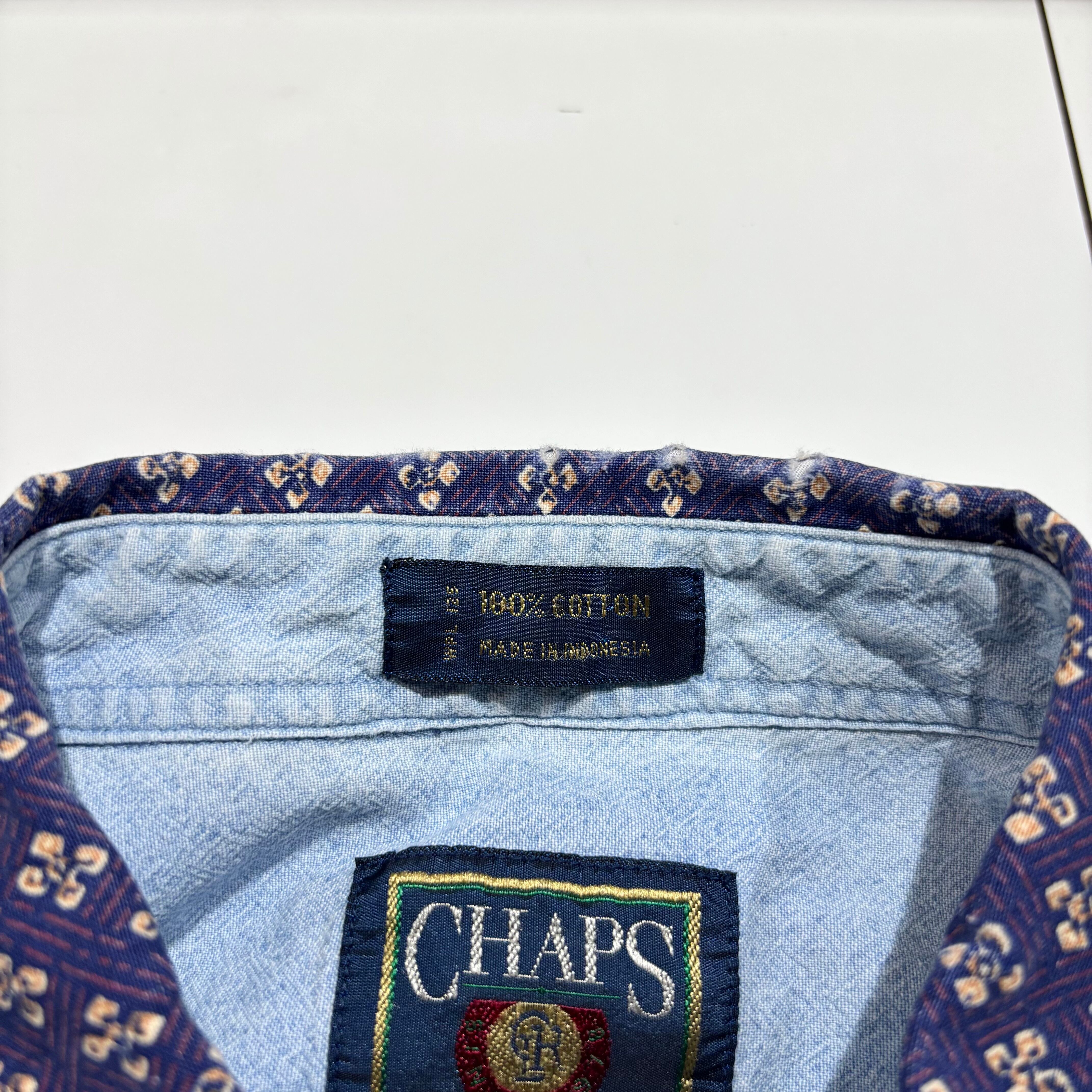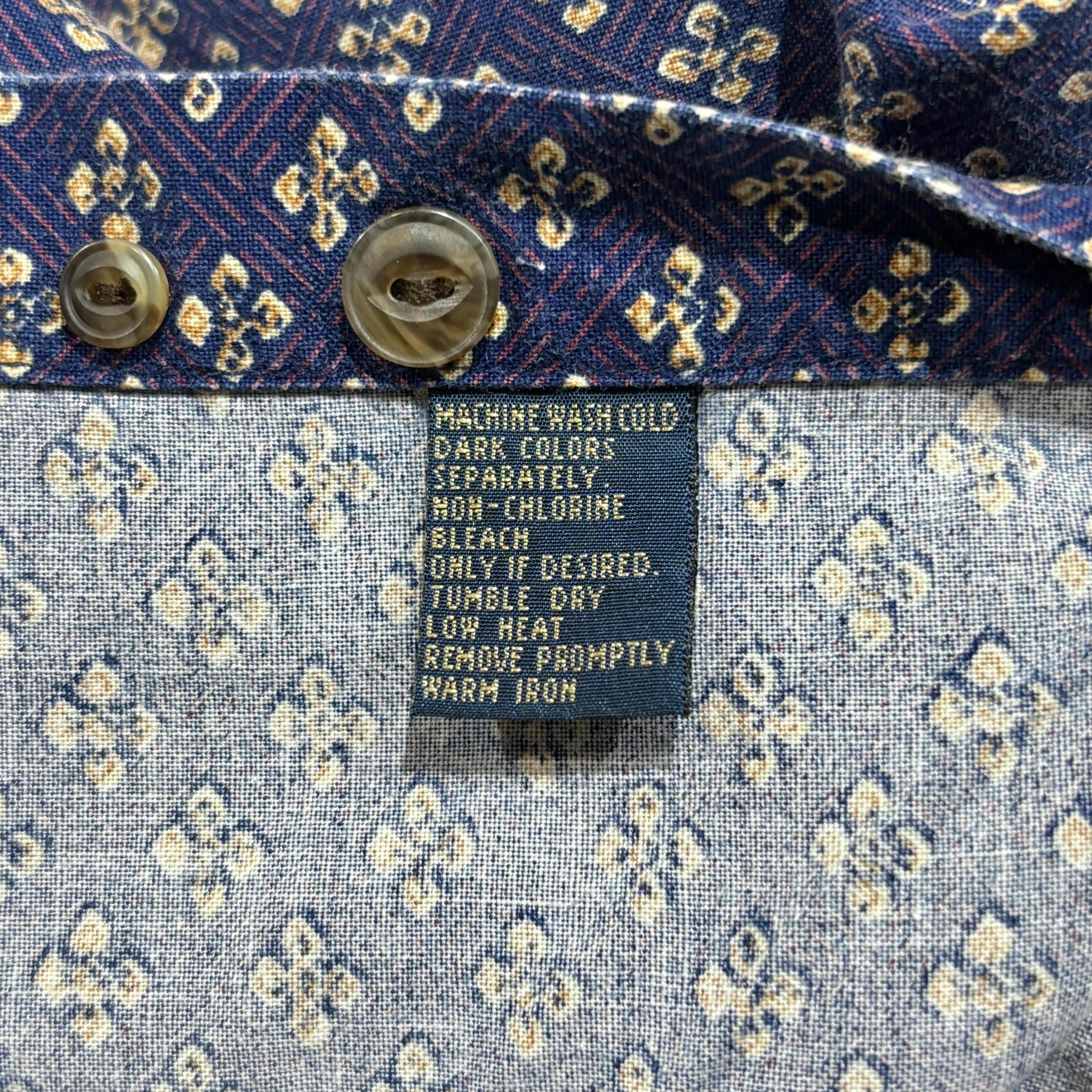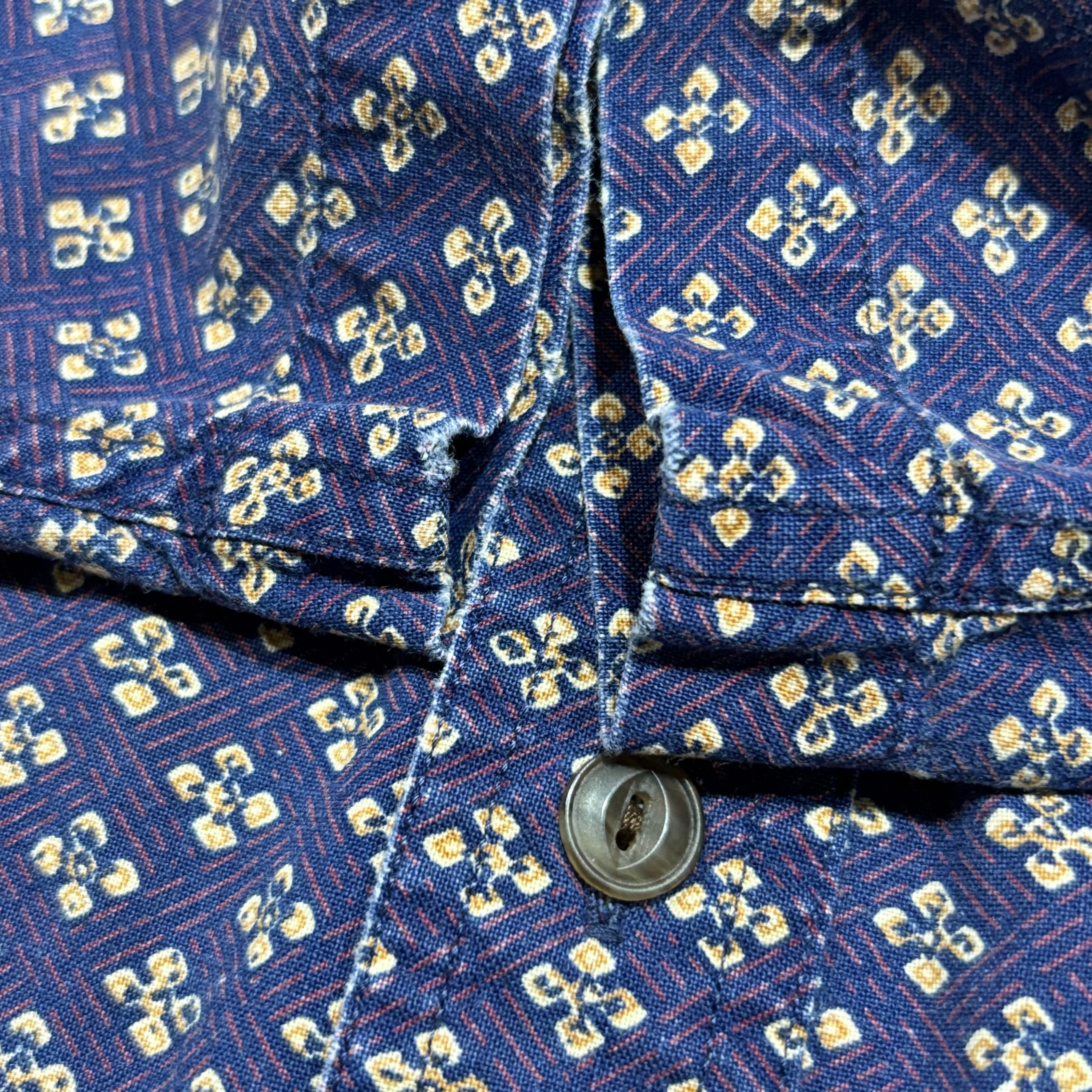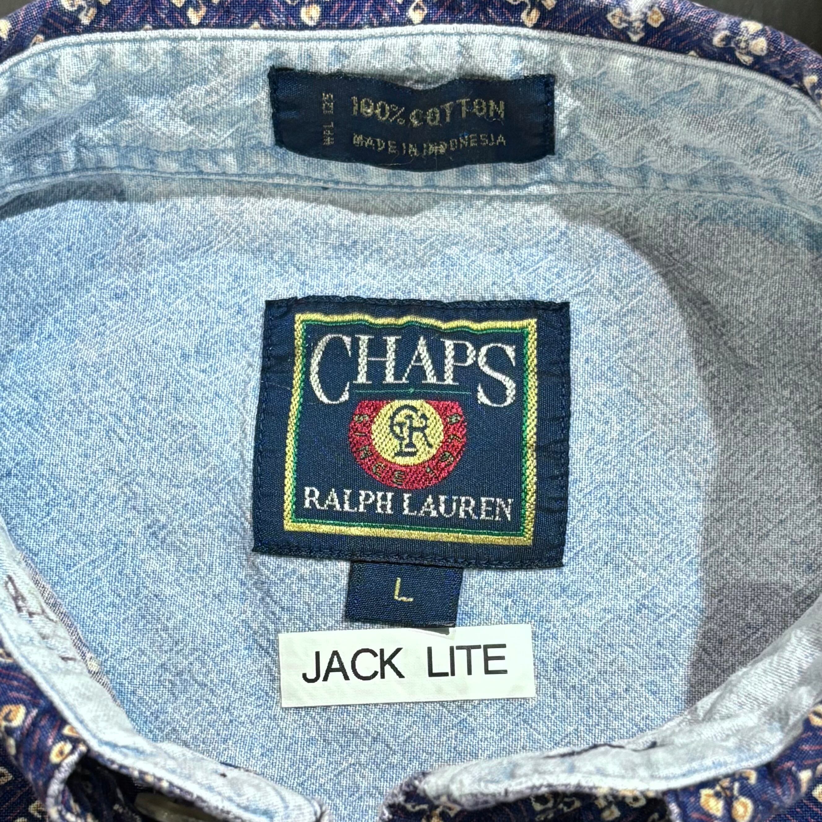 CHAPSらしい総柄のシャツです。何用で使っていたのかわかりませんが名前入りのシールがタグに貼ってあります。なにより柄が良いので店主もおススメの一着です!