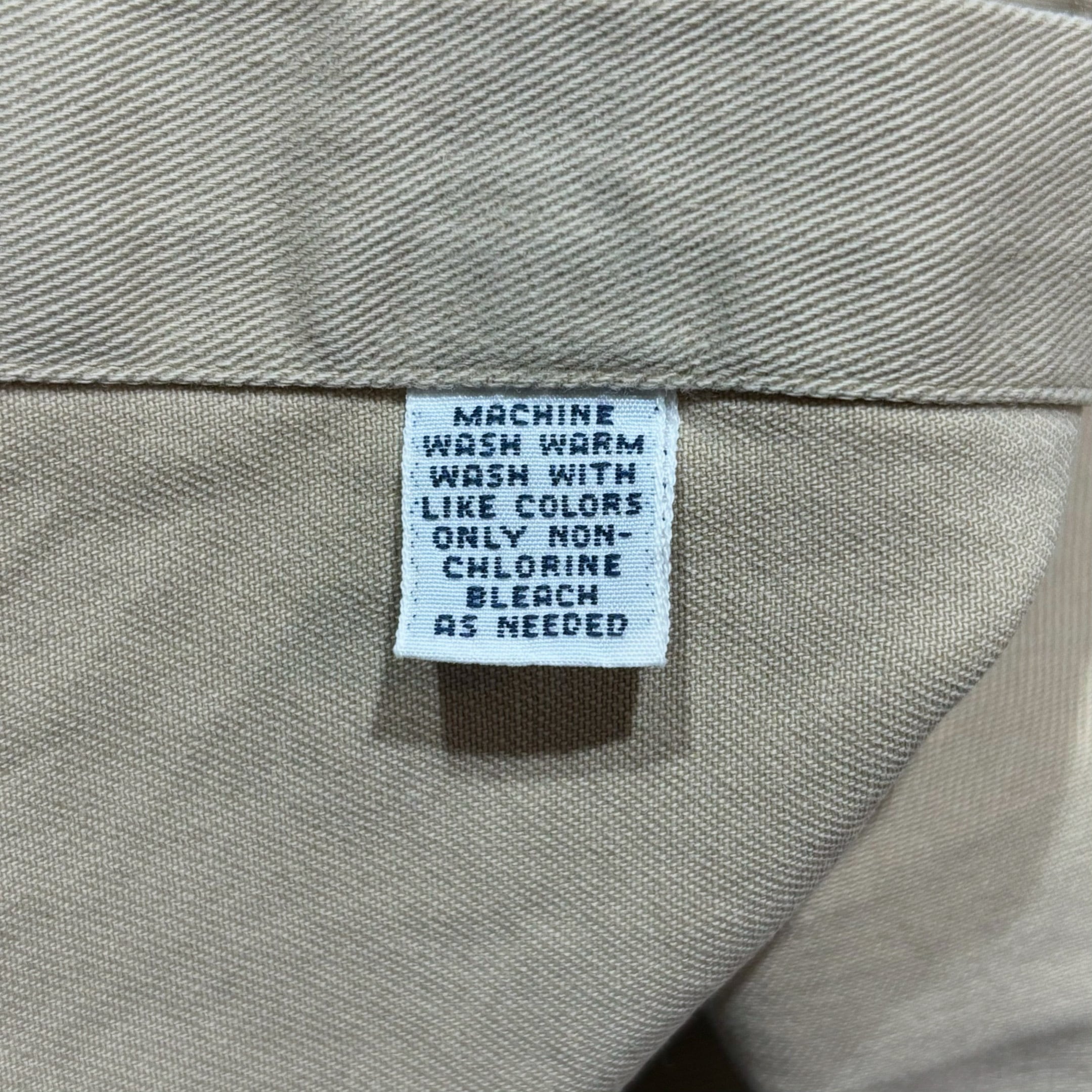 ハリのある生地と相まってどこか野暮ったさもある無地のベージュシャツです。